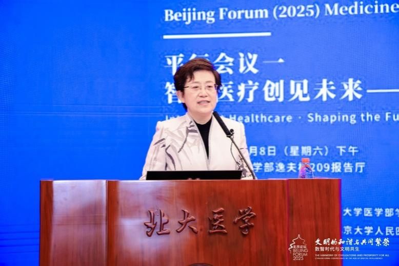 乔杰院士在致辞中指出,本届论坛以"数智技术驱动的医学创新与多学科融合"为核心主题,标志着医学发展进入以智能技术为引领的新阶段。她强调"医学+X"交叉融合是未来医学发展的重要方向,并设置了三个平行分论坛,分别聚焦宏观数据与医院管理、机器人及智能医疗器械、微观多组学与生命认知,体现了从临床应用到基础研究的全方位布局。同时特别提到,经过七八年的培育,北京大学在医学与人工智能融合领域已取得显著进展,孵育出一批创新成果。希望在"十四五"收官与"十五五"开局的关键时期,大家凝心聚力,共同推动医学创新发展,通过对生命的多维度认知,更好地守护人民健康。乔杰院士的致辞为论坛奠定了"数智驱动、融合创新"的基调,指明了新时代医学发展的前进方向。
